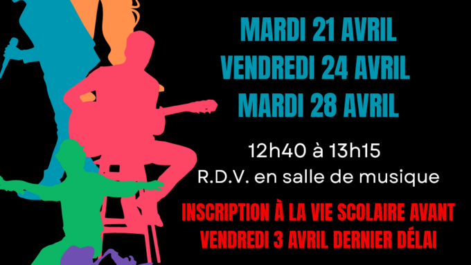 Par Administrateur schweitzer, publié le jeudi 26 mars 2026 15:13 - Mis à jour le lundi 30 mars 2026 08:30Auditions des talents pour la soirée du collège au Grand Marais. Dépêchez--vous, vous n'avez que jusqu'à vendredi prochain (le 3 avril) pour vous inscrire. L'inscription est à faire obligatoirement auprès de la Vie Scolaire. -