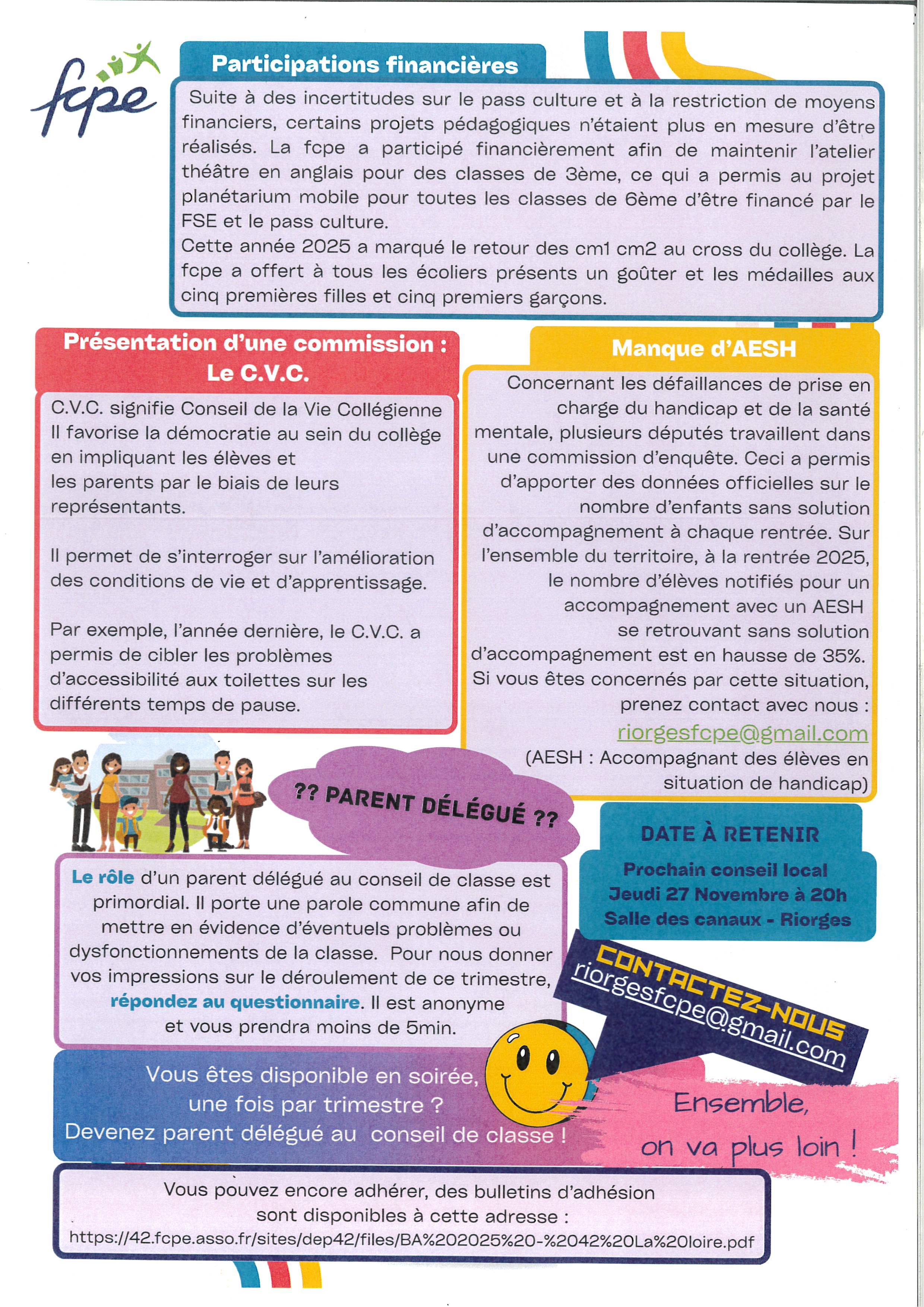 Le conseil local de Riorges permet aux parents de se rencontrer, de s'informer, d'échanger et de remplir leur rôle au sein de la communauté éducative.